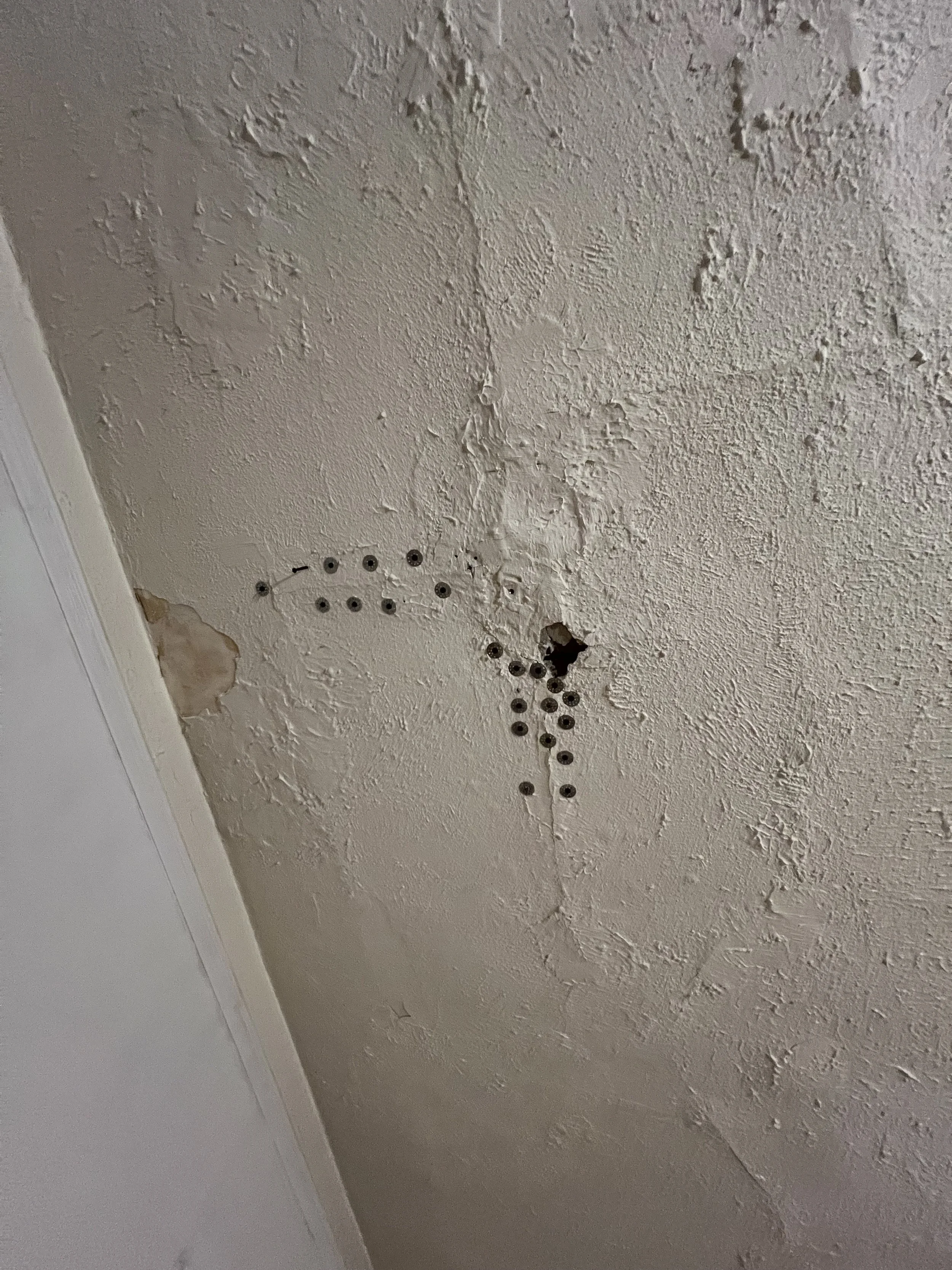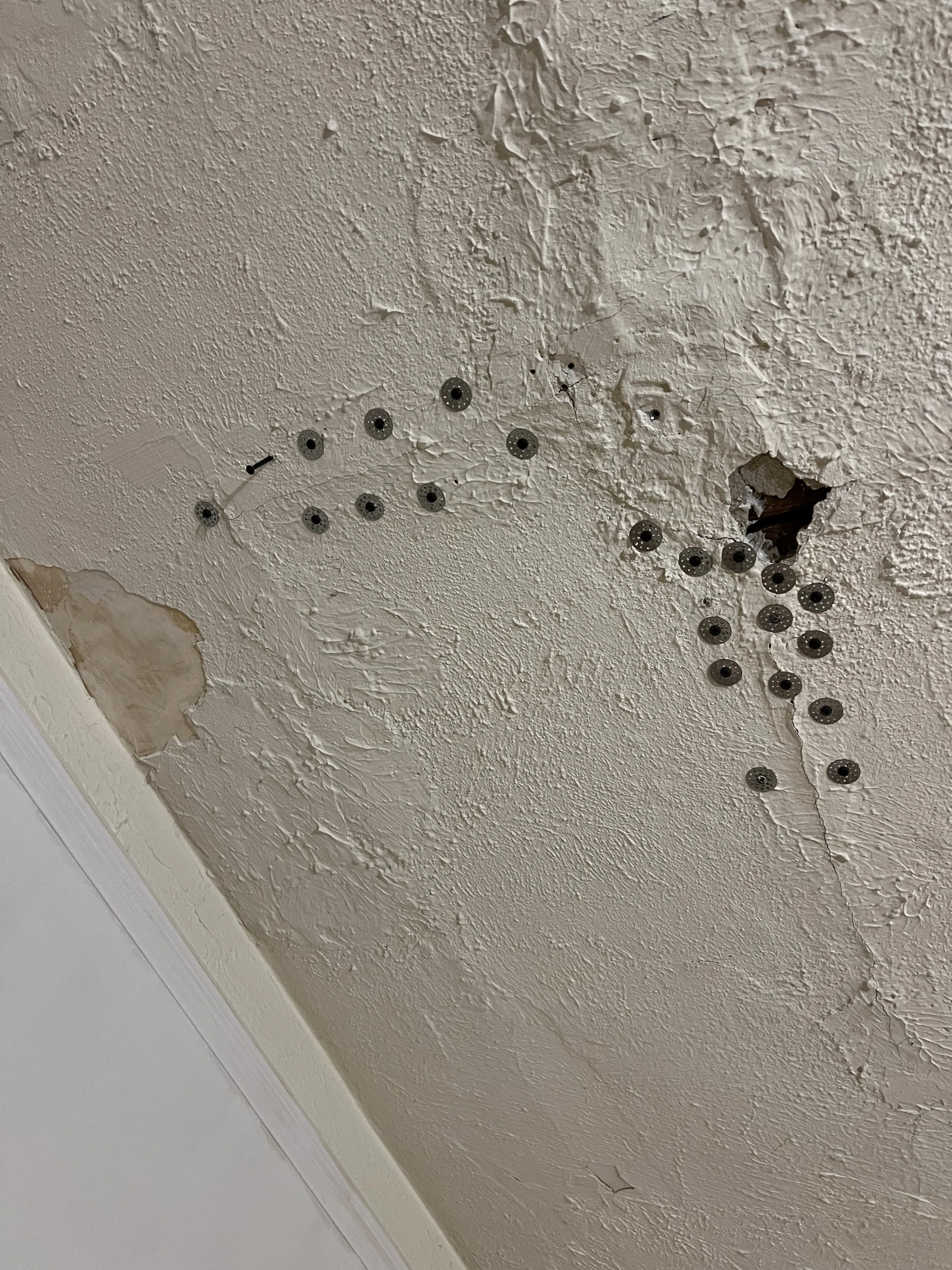 The living room ceiling, also lath and plaster, was in even worse shape, riddled with cracks and sagging from years of Midwest humidity seeping in through open windows. Plaster washers, liquid nails, and more wood glue became my go-to solution. After securing the plaster, I applied a fresh layer of drywall mud, carefully matching the existing ceiling texture for a uniform appearance.
