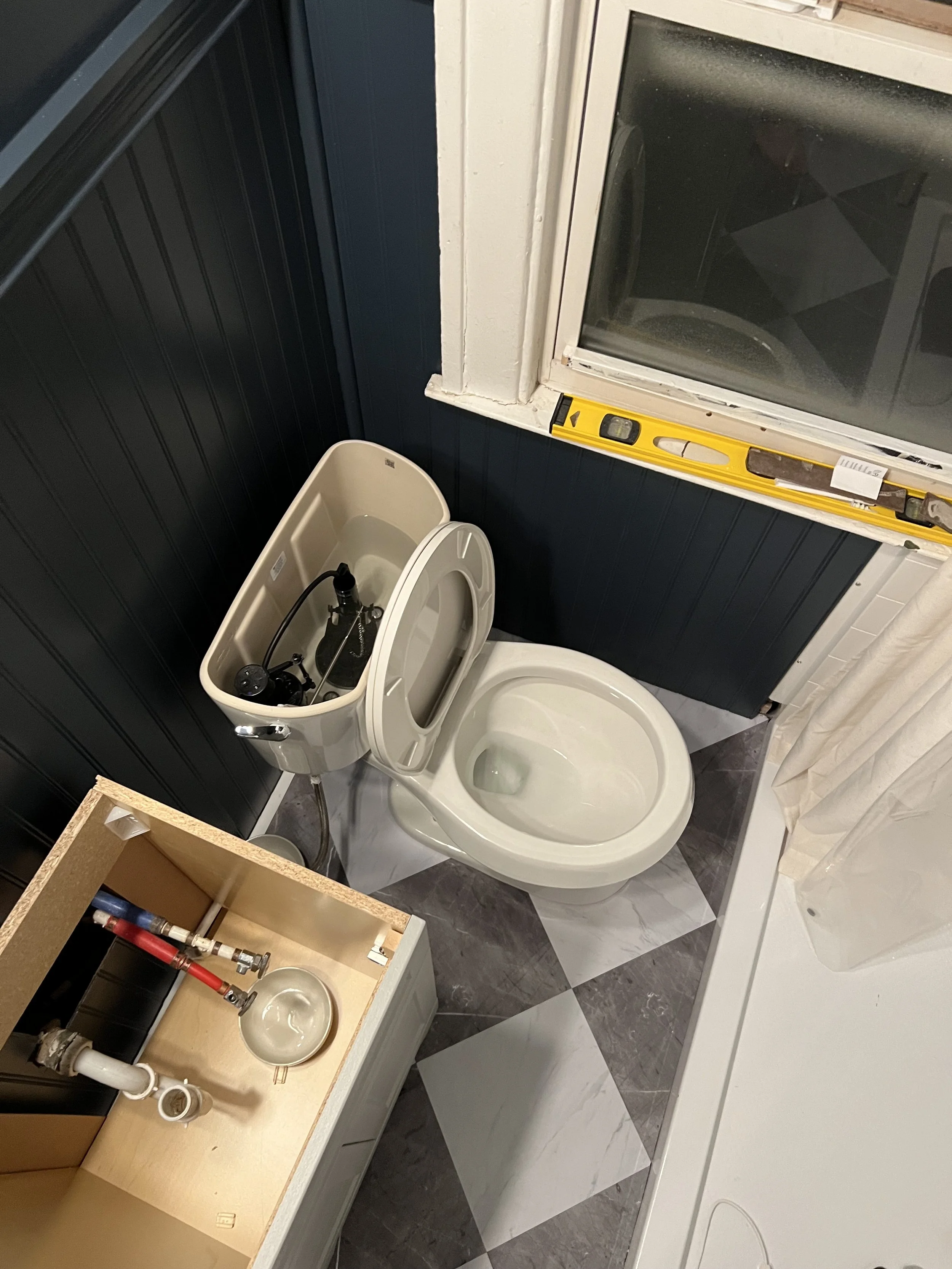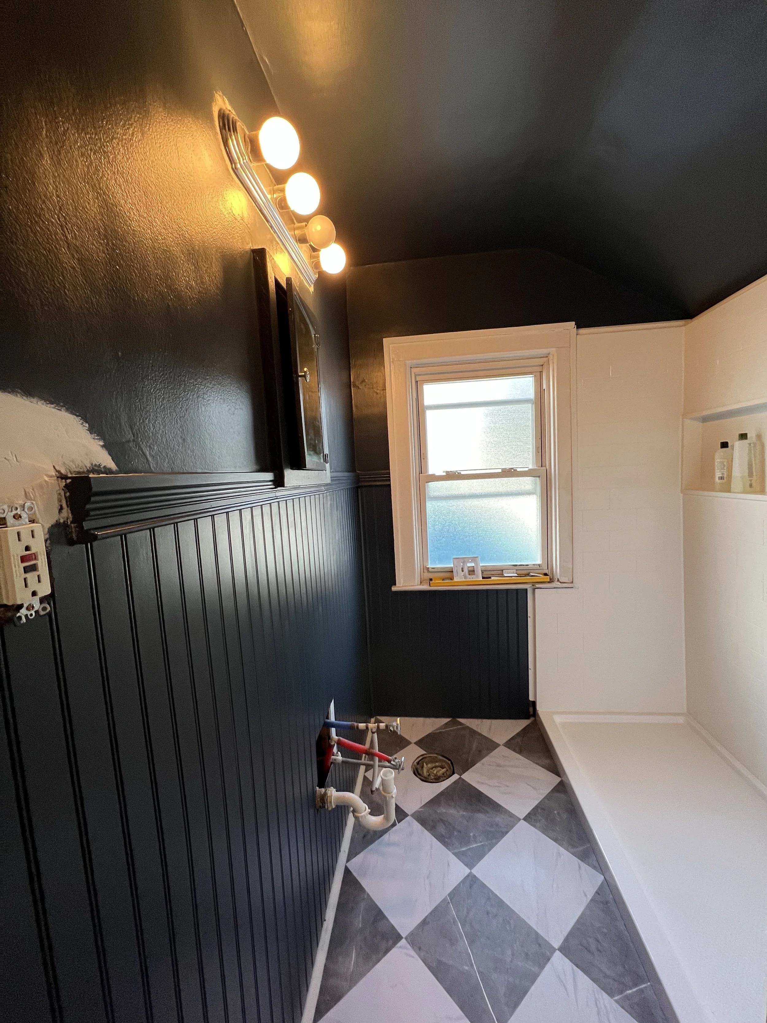 Due to a crooked and old cast iron toilet base drain, I had to use two wax rings and an adapter to ensure a good seal. Before painting, we scraped and applied joint compound to several spots on the ceiling where the paint was peeling due to water damage. For the new paint, I used the same semigloss finish as in the downstairs kitchen. We applied two coats of primer and three coats of the semigloss paint to thoroughly seal against water and steam.
