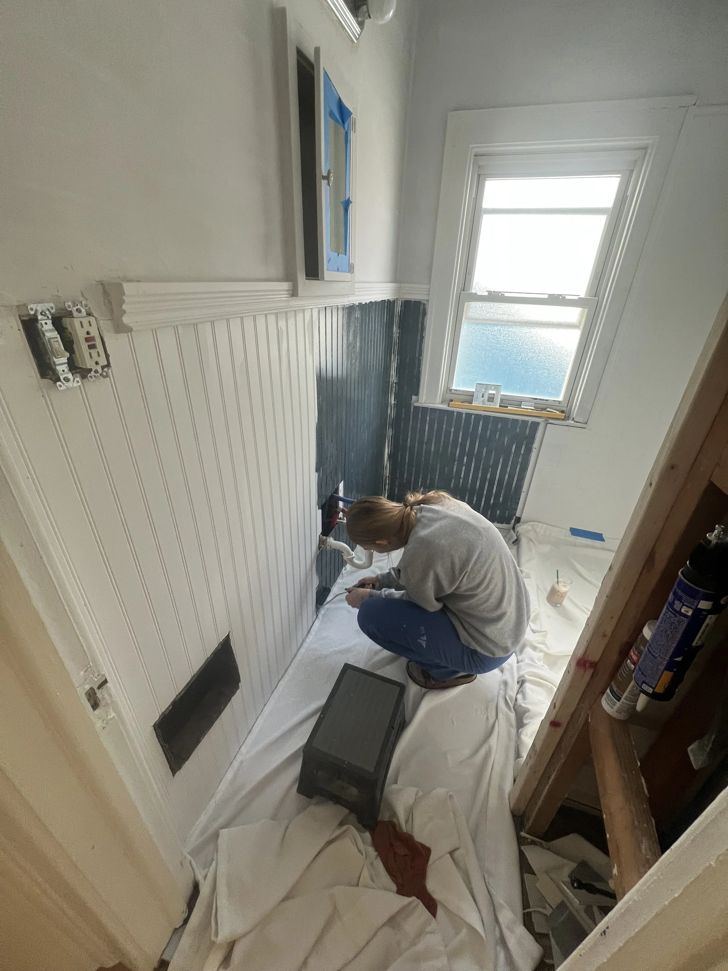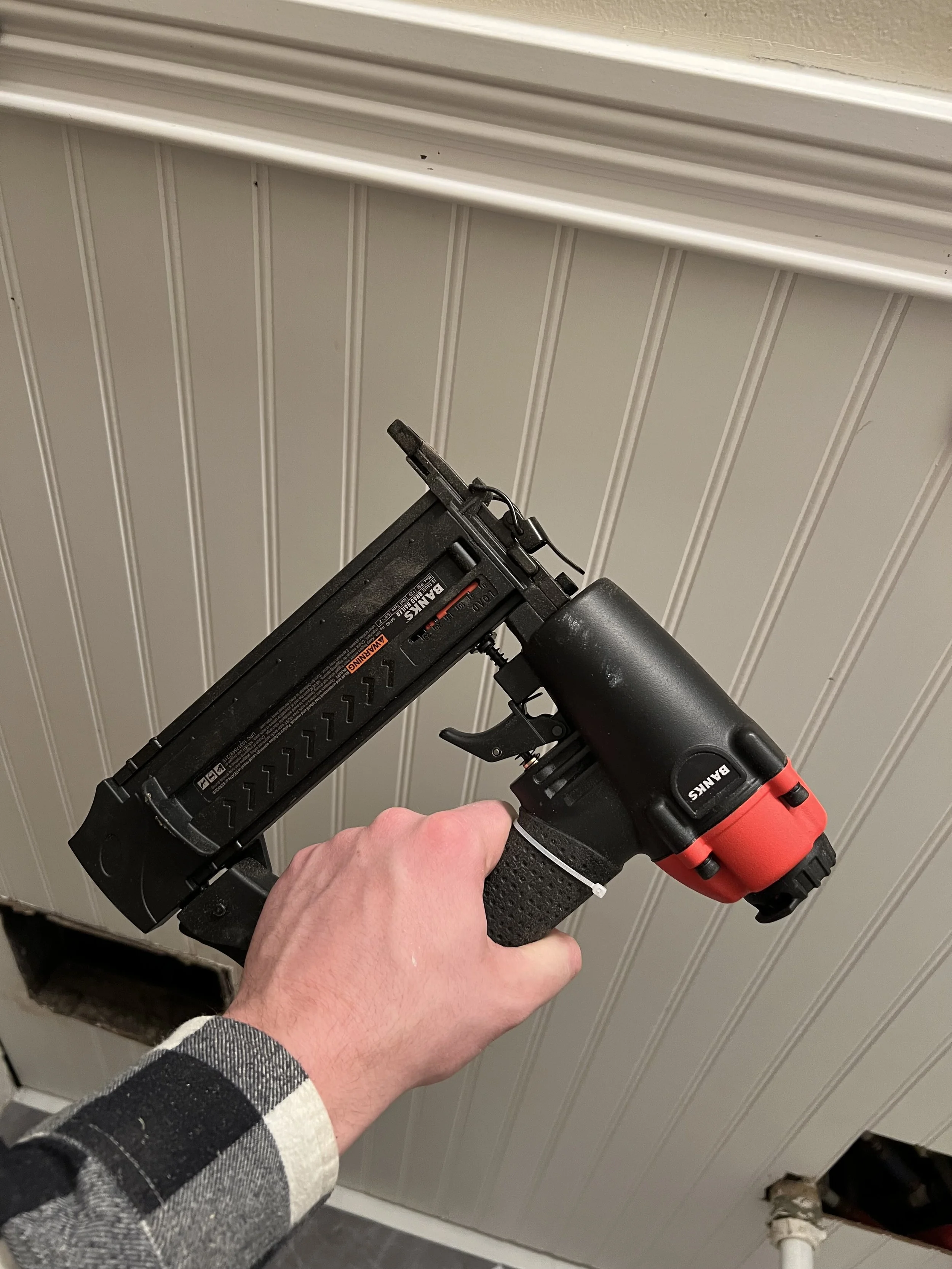 The existing lathe and plaster on the wall was quite uneven, with about a half-inch of plaster over the lath. To create a smooth base for the finishing beadboard, I screwed in 1/4-inch drywall directly over the lath. If you don’t already own one and plan on doing any trim or finishing work like this, I highly recommend buying a brad nailer. I learned this the hard way downstairs, where I spent two hours carefully hammering in nails to avoid damaging the paint or finish of the bead boards. The brad nailer, which cost only $30 at Harbor Freight, saved me several hours and neatly buries the nails, making them easy to fill or paint over. Once the beadboard and trim were up, we moved on to caulking and painting the walls. After the vanity base and toilet were installed, I added an extra rounded corner piece on the left wall to seamlessly bridge the gap between the wall and the tile.