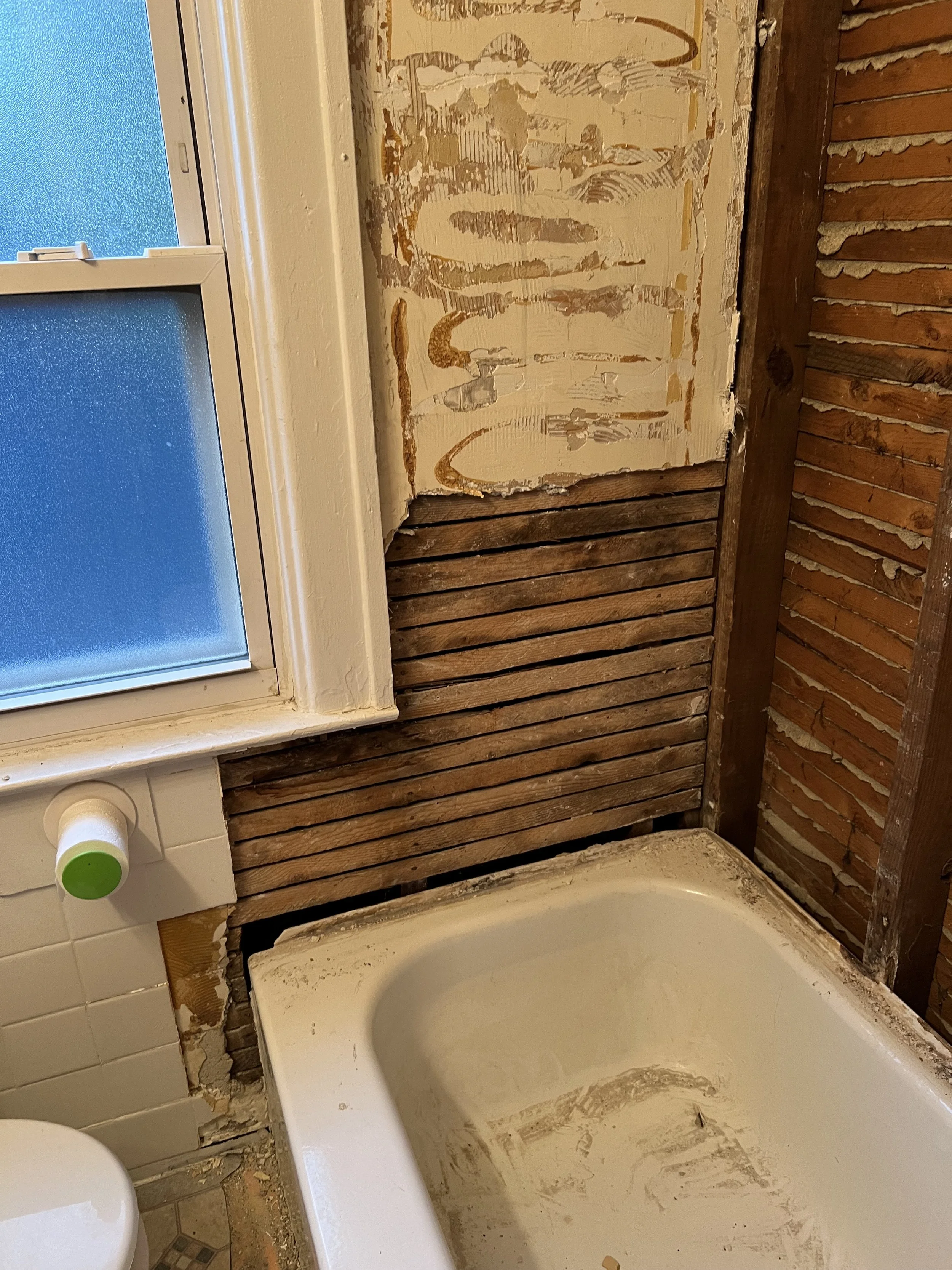 The existing lathe and plaster on the wall was quite uneven, with about a half-inch of plaster over the lath. To create a smooth base for the finishing beadboard, I screwed in 1/4-inch drywall directly over the lath. If you don’t already own one and plan on doing any trim or finishing work like this, I highly recommend buying a brad nailer. I learned this the hard way downstairs, where I spent two hours carefully hammering in nails to avoid damaging the paint or finish of the bead boards. The brad nailer, which cost only $30 at Harbor Freight, saved me several hours and neatly buries the nails, making them easy to fill or paint over. Once the beadboard and trim were up, we moved on to caulking and painting the walls. After the vanity base and toilet were installed, I added an extra rounded corner piece on the left wall to seamlessly bridge the gap between the wall and the tile.